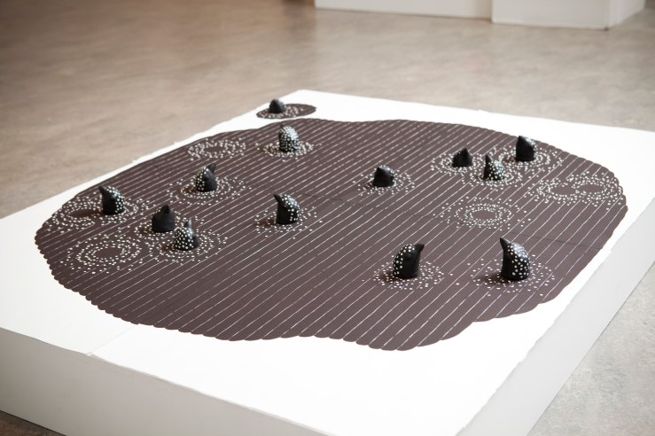 - Double spill, single spill, 15cm x 15cm x 6cm, Linocut, modelling clay and enamel. Edition of 10 Pardalote model sketch, 2016,